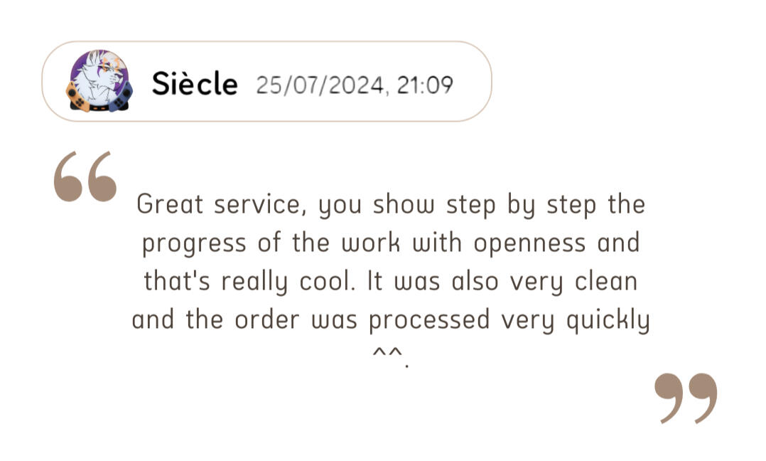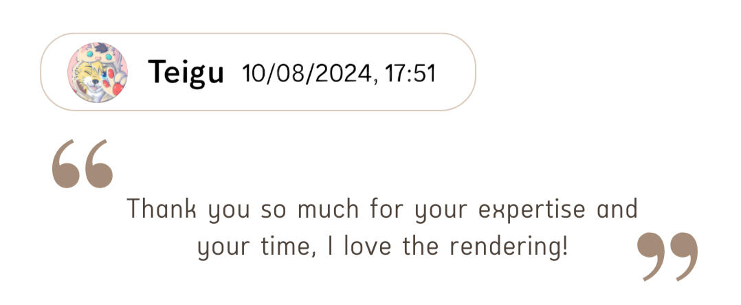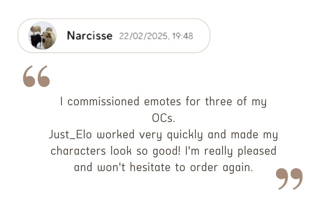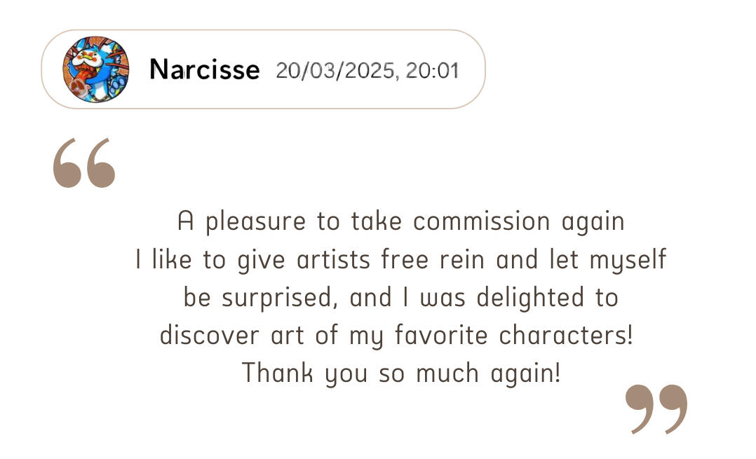 You can place your order directly by message on one of my networks or by e-mail. The contractual information is presented in French and will be confirmed at the latest when your order is validated [Order summary invoice including a short description/the price of your order].To ensure the best possible processing of your order, you will be asked to provide one or more recent and/or current reference images of your character.