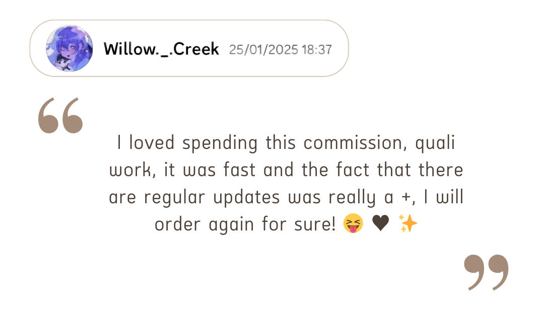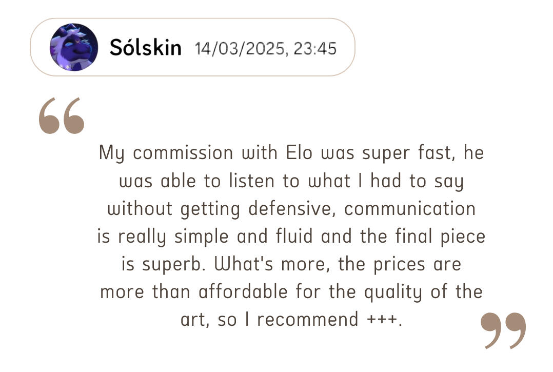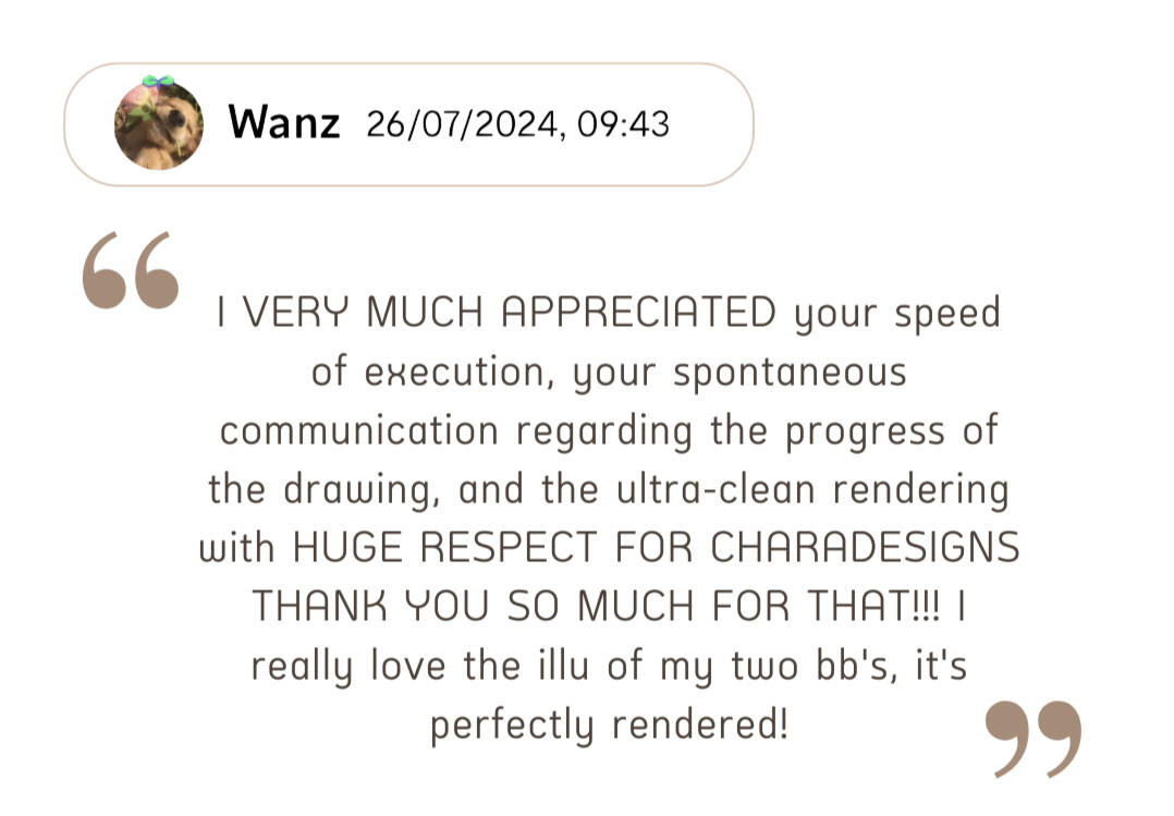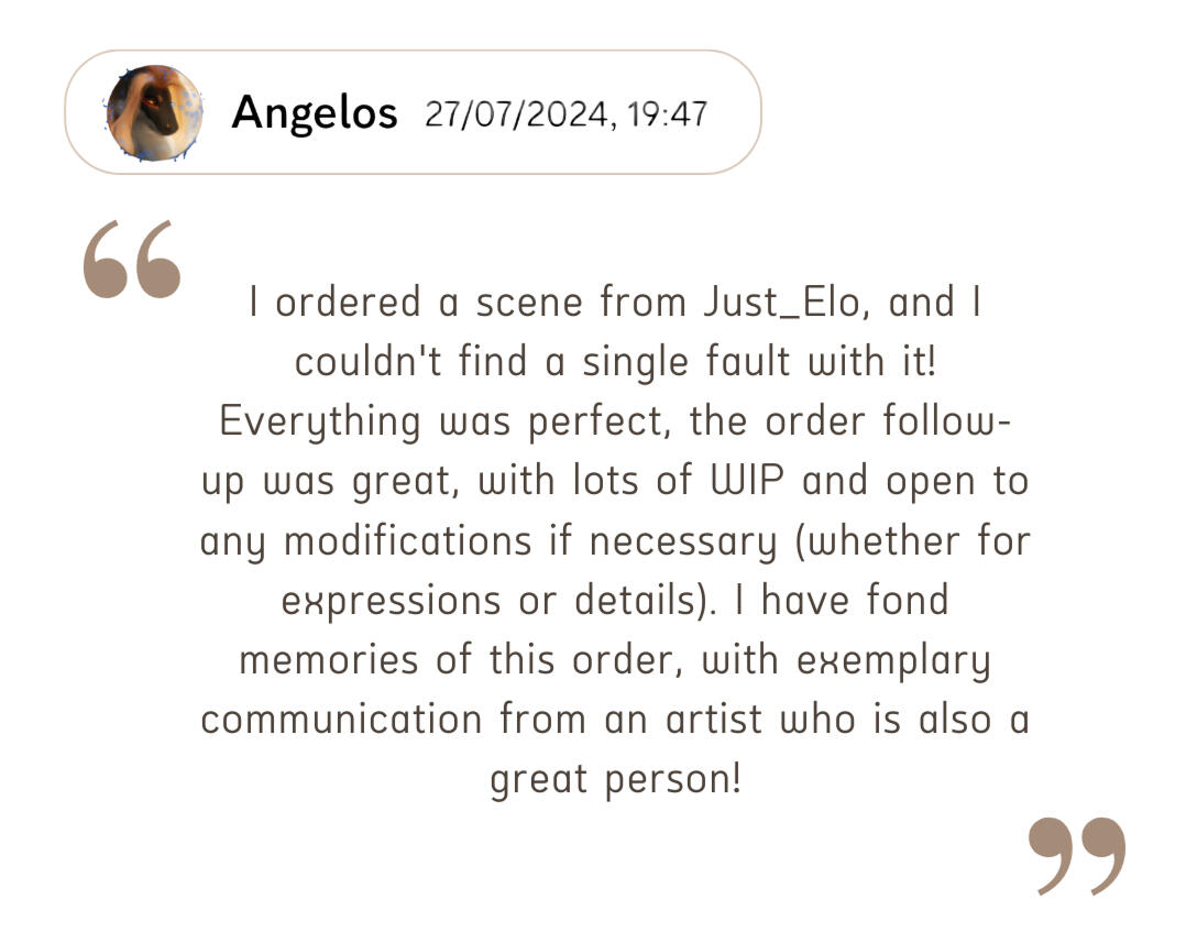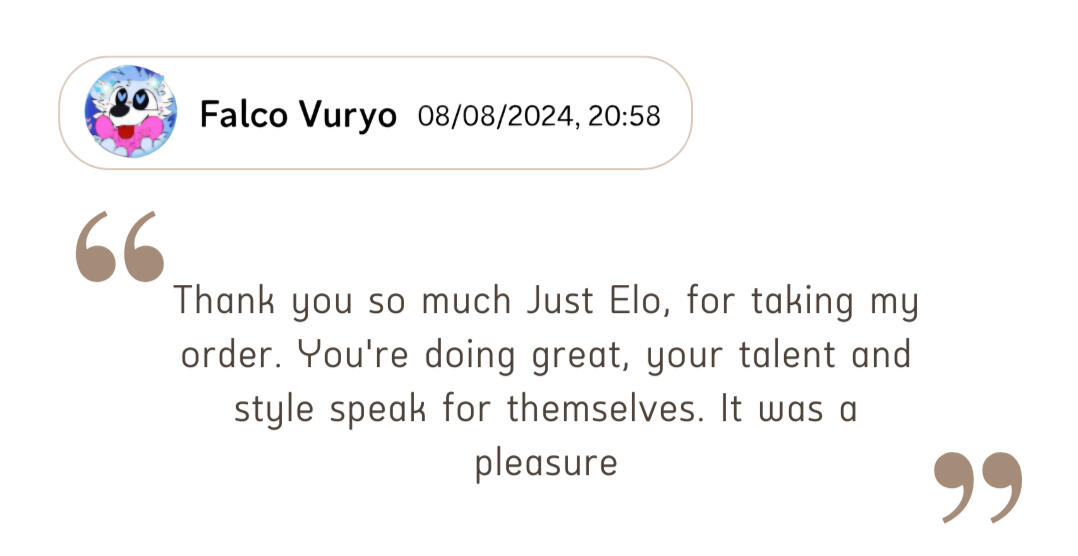 Payment for your order is made in euros and with Paypal only. By validating the invoice sent to you, you agree to pay the price indicated. You guarantee that you are fully authorized to use this means of payment, and that it gives access to sufficient funds to cover all costs resulting from your order. The order can only be started or continued after full payment of the price corresponding to the invoice sent. Payment plans can be discussed, in which you will be asked to make an initial payment of at least 50% of the total price. Illustrations remain the property of Just_Elo until full payment has been received.