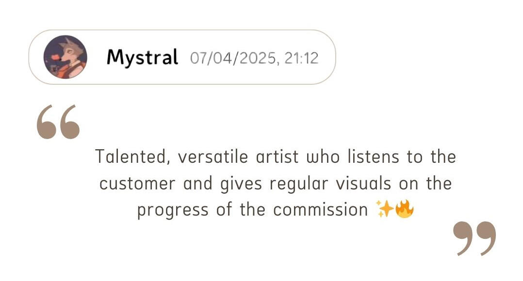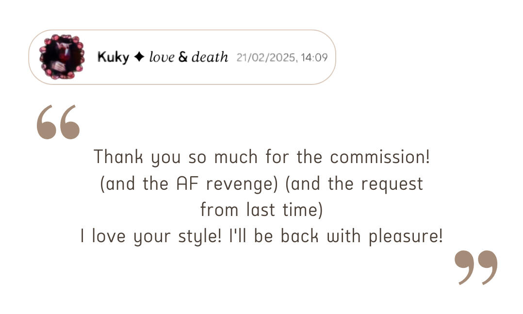 - display or publication of the commissioned work on the customer's social networks, galleries or websites.Commercial use of commissioned works is not permitted without prior agreement. Commercial use includes: