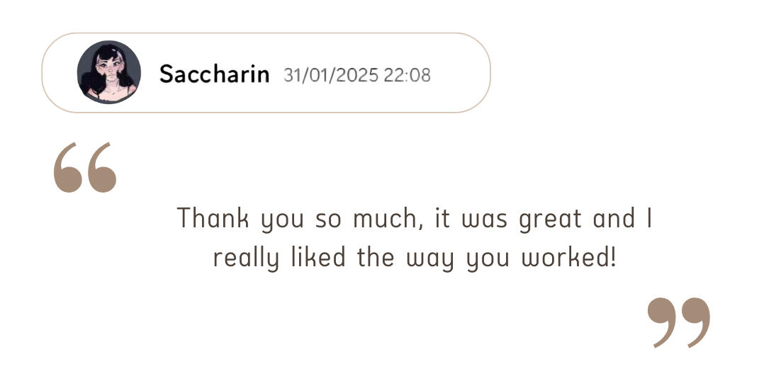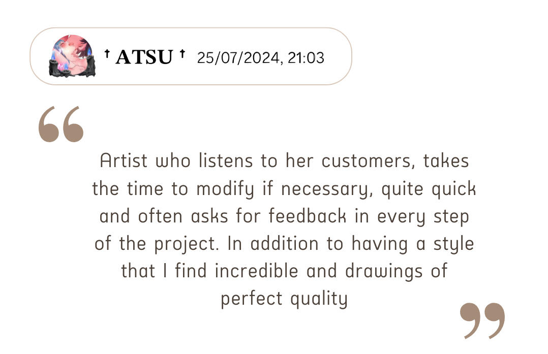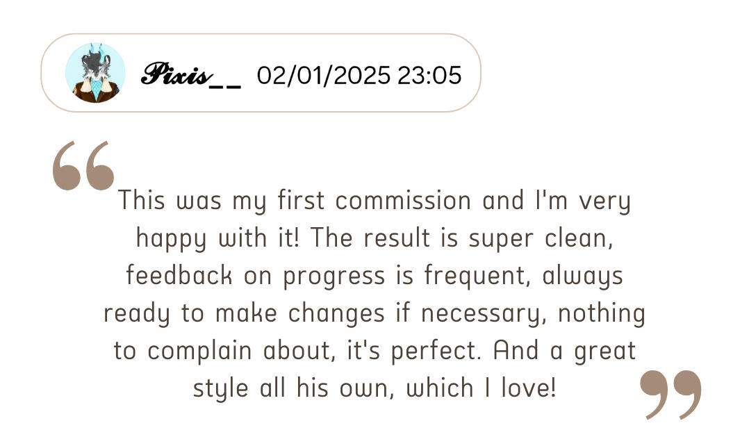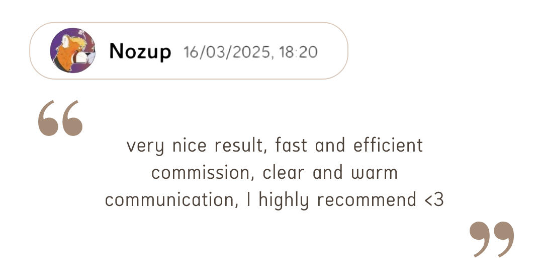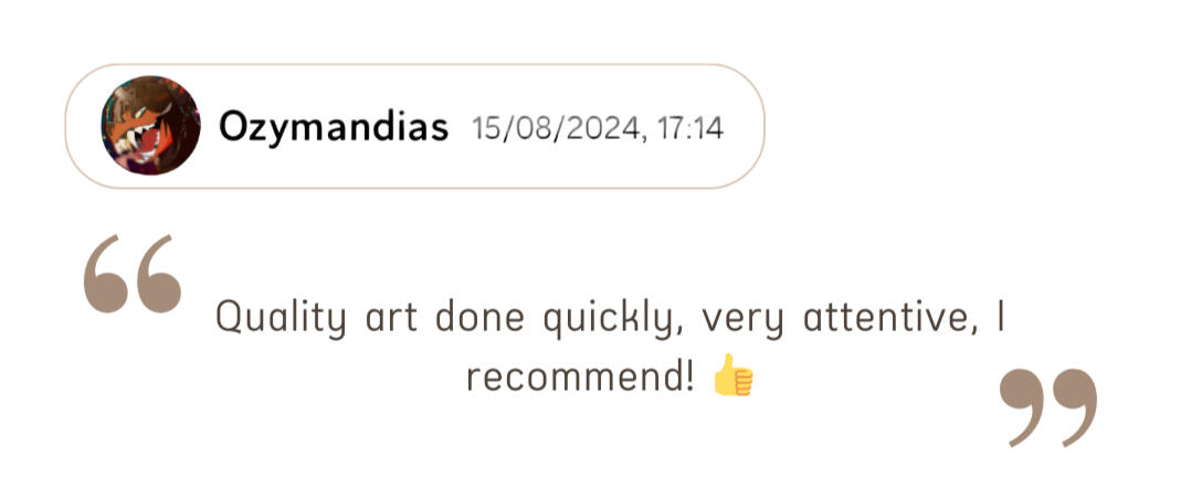 You can place your order directly by message on one of my networks or by e-mail. The contractual information is presented in French and will be confirmed at the latest when your order is validated [Order summary invoice including a short description/the price of your order].To ensure the best possible processing of your order, you will be asked to provide one or more recent and/or current reference images of your character.