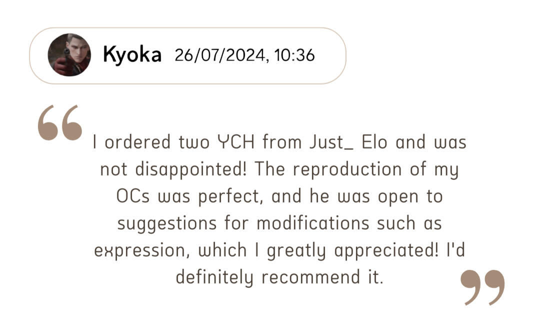 Payment for your order is made in euros and with Paypal only. By validating the invoice sent to you, you agree to pay the price indicated. You guarantee that you are fully authorized to use this means of payment, and that it gives access to sufficient funds to cover all costs resulting from your order. The order can only be started or continued after full payment of the price corresponding to the invoice sent. Payment plans can be discussed, in which you will be asked to make an initial payment of at least 50% of the total price. Illustrations remain the property of Just_Elo until full payment has been received.