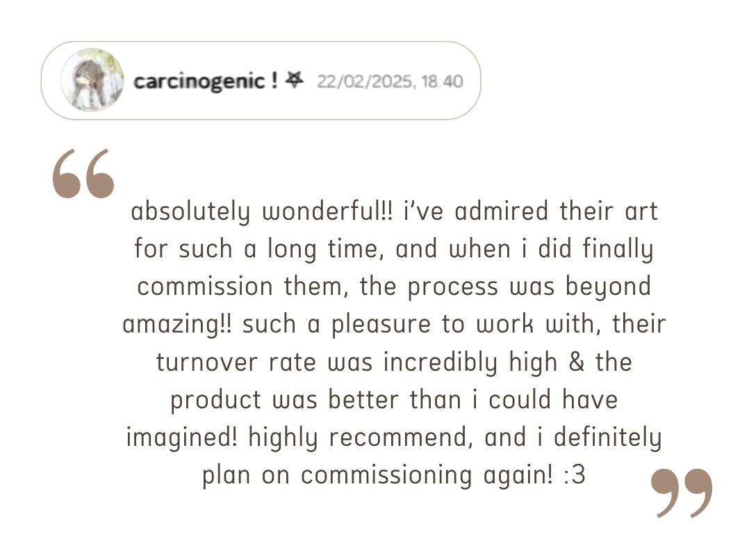 - display or publication of the commissioned work on the customer's social networks, galleries or websites.Commercial use of commissioned works is not permitted without prior agreement. Commercial use includes: